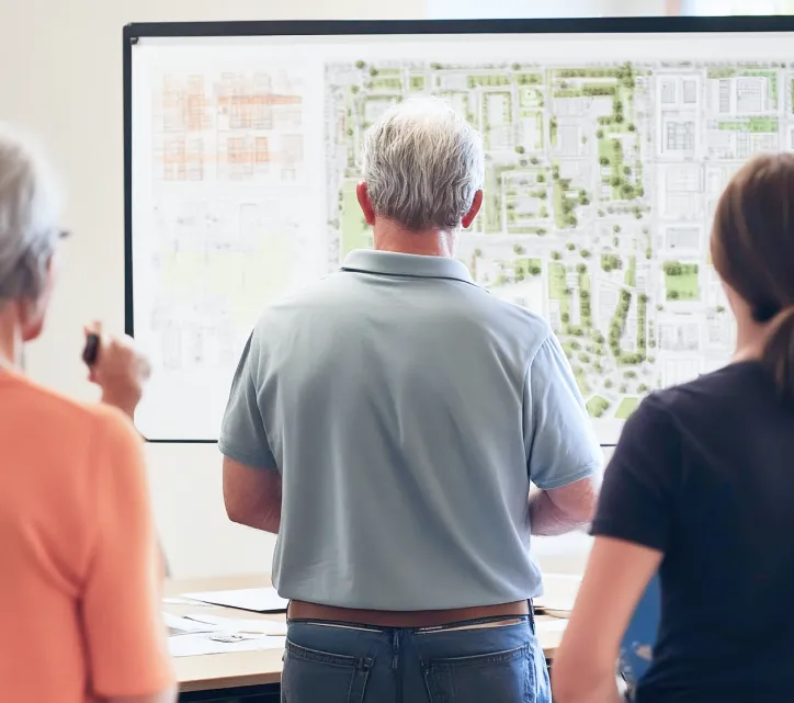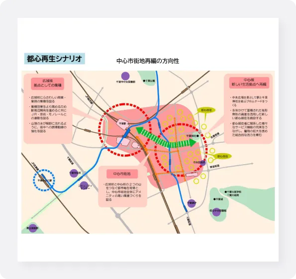 データや都市構造から見える地域課題の解決に向けて、行政によるまちづくり方針に沿った地域のビジョンを検討し、策定します。