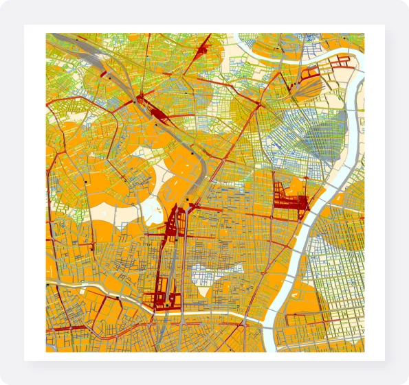 都市構造はまちの現在を作り出した骨格です。まちの賑わいや古くからの伝統など、まちやまちに関わる人々に恩恵をもたらすとともに、一方でまちの発展を妨げるような不調和が表されていることが見受けられます。このように都市構造を深読みすることで、現在の環境がもたらした恩恵と課題を見いだし、更なる恩恵の享受と課題解決の方向性を探ります。